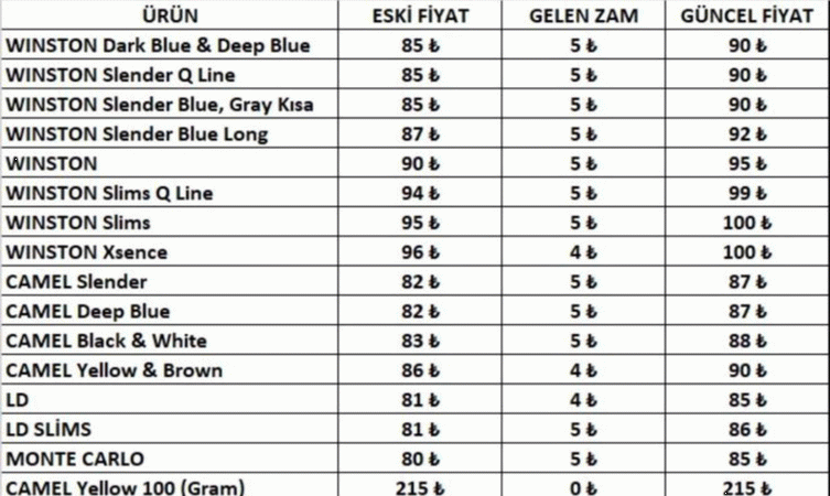 Zam dalgası Camel grubunu da etkiledi. Camel Slender ve Camel Deep Blue'nun fiyatı 87 TL’ye yükselirken, Camel Yellow & Brown ürünleri artık 90 TL’den satılacak. Uygun fiyatlı seçenek olarak bilinen LD markasında da fiyatlar değişti; klasik LD 85 TL olurken, LD Slims 86 TL’ye çıktı. Monte Carlo ise 85 TL olarak güncellendi.