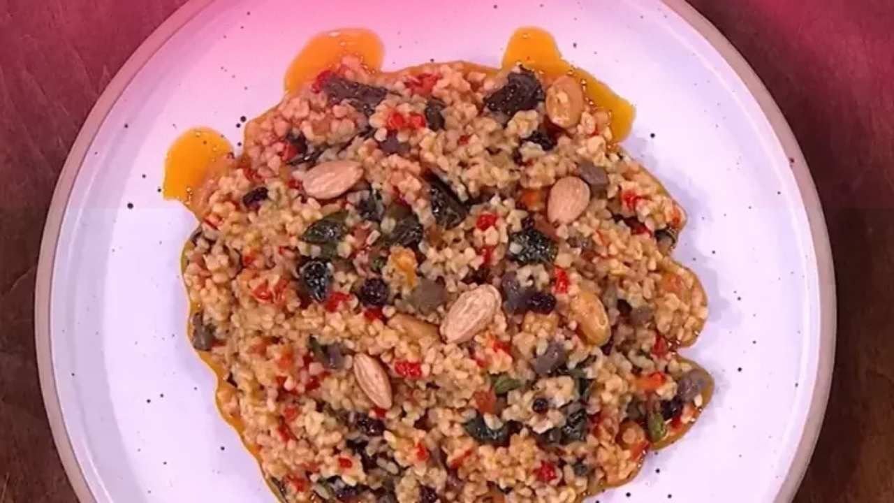 Öncelikle kuş üzümlerini ılık suda 10 dakika kadar bekletin, ardından süzün. Ciğerleri küçük küpler halinde doğrayın ve bir tavada sade yağla hafifçe soteleyin. Ayrı bir tencerede tereyağı ve sıvı yağı ısıtın. İnce doğranmış kuru soğanı ekleyip pembeleşene kadar kavurun. Üzerine doğranmış kapya biberi ve rendelenmiş domatesi ekleyin, birkaç dakika pişirin. Sotelediğiniz ciğerleri, kuş üzümlerini ve file bademleri tencereye ekleyin. Baharatları ve tuzu ilave edin, ardından bulguru ekleyip birkaç dakika kavurun. Sıcak et veya tavuk suyunu yavaşça dökün. Kapağını kapatıp kısık ateşte suyunu çekene kadar pişirin. Piştikten sonra 10 dakika kadar demlenmeye bırakın. Ardından servis tabağına alın ve üzerine hafifçe badem serperek sunun.