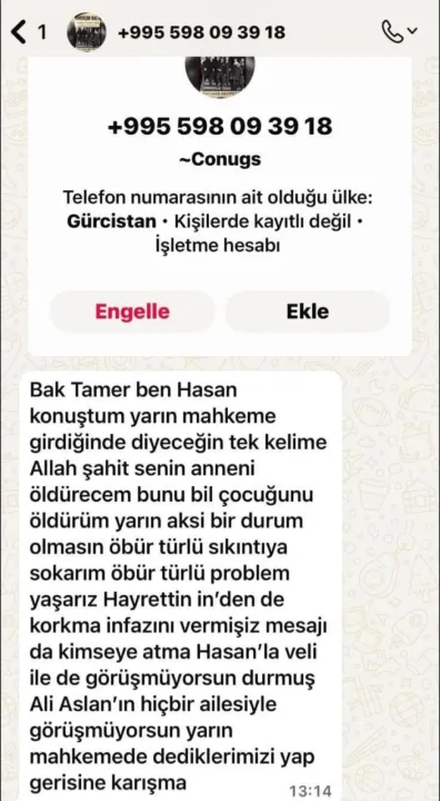 "Anneni öldüreceğim, çocuğunu öldürürüm yarın mahkemede dediklerimizi yap kimseye mesajı gösterme Durmuş Ali Arslan’ın ailesiyle görüşmeyeceksin"