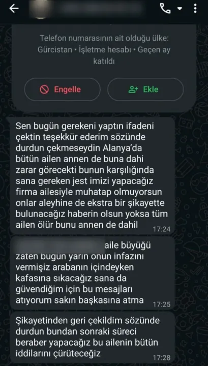 Duruşmadan iki gün sonra Antalya Adliyesi’ne gelerek suç duyurusunda bulunan Ertürk, duruşma öncesi ve sonrası telefonuna gelen mesajları gösterdi. Ertürk, duruşmadan bir gün önce yurt dışı kodlu kimliği belirsiz bir numaradan,