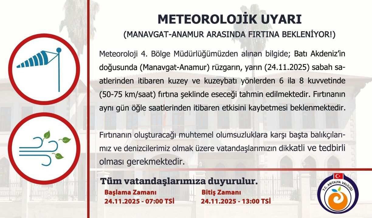 "Yapılan son meteorolojik değerlendirmelere göre; Batı Akdeniz’in doğusunda (Manavgat-Anamur) rüzgarın, yarın (24.11.2025) sabah saatlerinden itibaren kuzey ve kuzeybatı yönlerden 6 ila 8 kuvvetinde (50-75 km/saat) fırtına şeklinde eseceği tahmin edilmektedir. Fırtınanın aynı gün öğle saatlerinden itibaren etkisini kaybetmesi beklenmektedir.