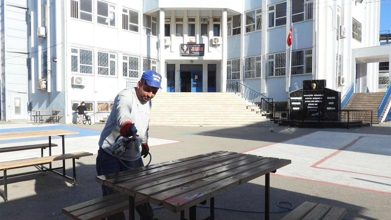 Kepez Belediyesi’nin Fen İşleri Müdürlüğü, Park ve Bahçeler Müdürlüğü ile Temizlik İşleri Müdürlüğü ekipleri ilçe genelindeki okullarda çalışmalarını koordineli bir şekilde yürütüyor. Park ve Bahçeler Müdürlüğü ekipleri, okul bahçelerinde risk oluşturan ağaç dallarını buduyor, kullanım ömrünü tamamlamış ve öğrenciler için tehlike yaratabilecek oturma bankları ile kamelyaları onarıp boyayarak yeniliyor. Temizlik İşleri Müdürlüğü ekipleri ise okul bahçelerini süpürge araçlarıyla kapsamlı bir şekilde temizledikten sonra, su arasözleriyle yıkayarak hijyenik bir ortam sağlıyor. Fen İşleri Müdürlüğü ekipleri de zamanla silinerek görünürlüğünü kaybeden sıra çizgilerini, spor alanlarını ve çocuk oyun alanlarını yeniden boyayarak öğrencilerin güvenli bir şekilde kullanabileceği alanlar oluşturuyor.