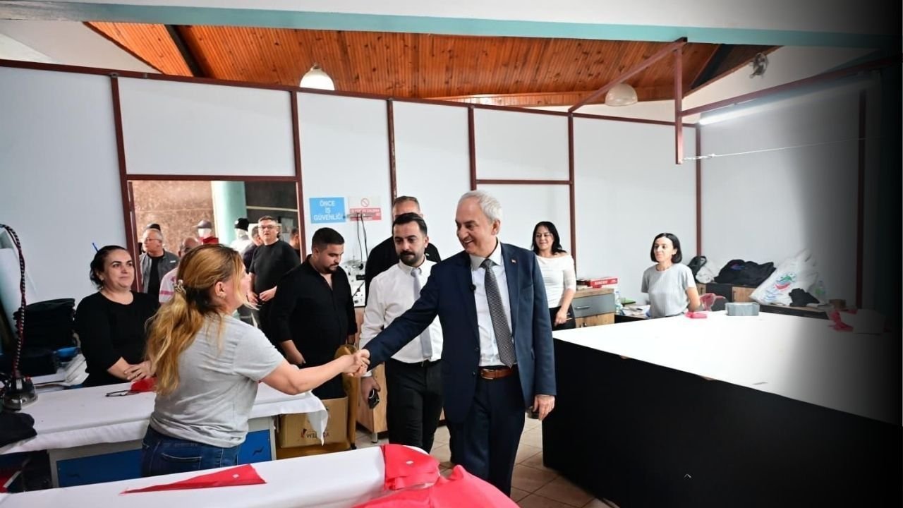 Kepez Belediye Başkanı Mesut Kocagöz, kadın emeğiyle büyüyen ve belediye bütçesine önemli katkılar sunan Tekstil Atölyesi’ni ziyaret etti. Atölyede üretim yapan kadınlara kolaylıklar diledi. Onlarla sohbet ederek hal hatır sordu. Arazide görev yapan personeli yağışlardan korumak için hazırlanan yağmurlukları inceleyen Kocagöz, yağmurluğu üzerine giyerek ürünü test etti. Başkan Kocagöz,