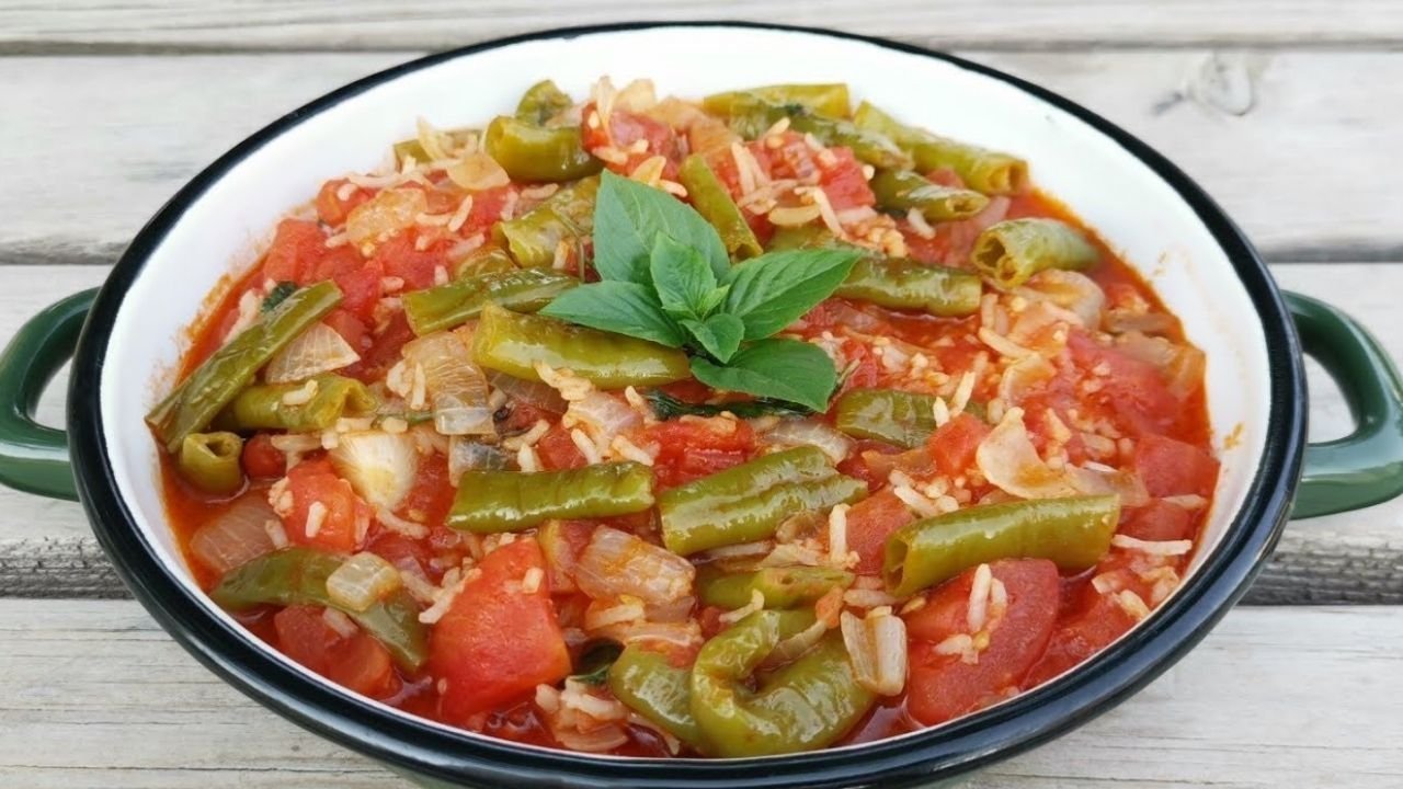 İnce doğranmış soğan ve biberleri zeytinyağında kavurun. Kabukları soyulmuş, doğranmış domatesleri ekleyin. Domatesler suyunu salıp yemeğin temel suyunu oluşturur; genellikle su eklenmez. Sarımsak ve fesleğeni ekleyip kısık ateşte pişmeye bırakın. Domatesler piştikten sonra bulgur veya pirinci ekleyin ve malzemeler yumuşayıp lezzetler özleşene kadar pişirin. Ocak kapandıktan sonra biraz dinlendirin. Sıcak veya ılık servis yapılabilir. Öyle ki, kimi zaman soğuk bile tüketiliyor.
