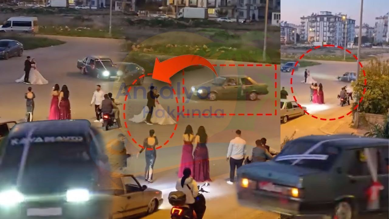 Antalya’nın Kepez ilçesine bağlı Sütçüler Mahallesi’nde bir düğünde yaşanan tehlikeli anlar, cep telefonu kamerasına yansıdı. Gelin ve damadın yol ortasında eğlendiği sırada bir aracın etraflarında drift atması, olası bir kazaya davetiye çıkarırken görüntüler izleyenlerin yüreğini ağza getirdi.