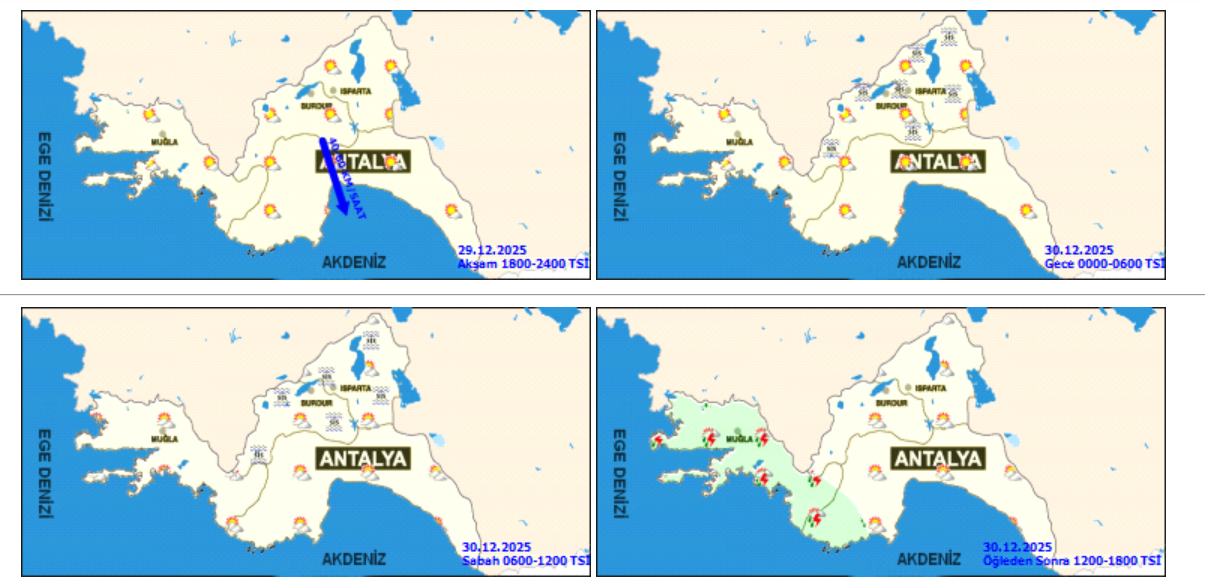 Meteoroloji Genel Müdürlüğü'nden alınan bilgilere göre   Antalya ve ilçelerinde 30 Aralık Salı günü (Bugün) havanın parçalı yer yer çok bulutlu, öğleden sonra Muğla çevrelerinin aralıklı sağanak ve gök gürültülü sağanak yağışlı geçeceği tahmin ediliyor. Gece ve sabah saatlerinde iç kesimlerde pus yer yer sis hadisesi bekleniyor.