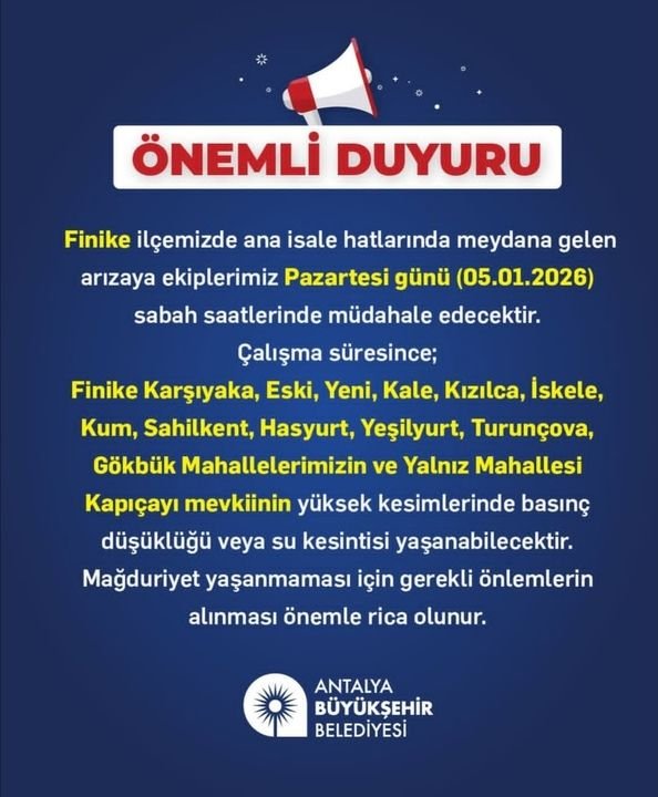 "Finike ilçemizde ana isale hatlarında meydana gelen arızaya ekiplerimiz Pazartesi günü (05.01.2026) sabah saatlerinde müdahale edecektir. Çalışma süresince; Finike Karşıyaka, Eski, Yeni, Kale, Kızılca, İskele, Kum, Sahilkent, Hasyurt, Yeşilyurt, Turunçova, Gökbük Mahallelerimizin ve Yalnız Mahallesi Kapıçayı mevkiinin yüksek kesimlerinde basınç düşüklüğü veya su kesintisi yaşanabilecektir. Mağduriyet yaşanmaması için gerekli önlemlerin alınması önemle rica olunur."