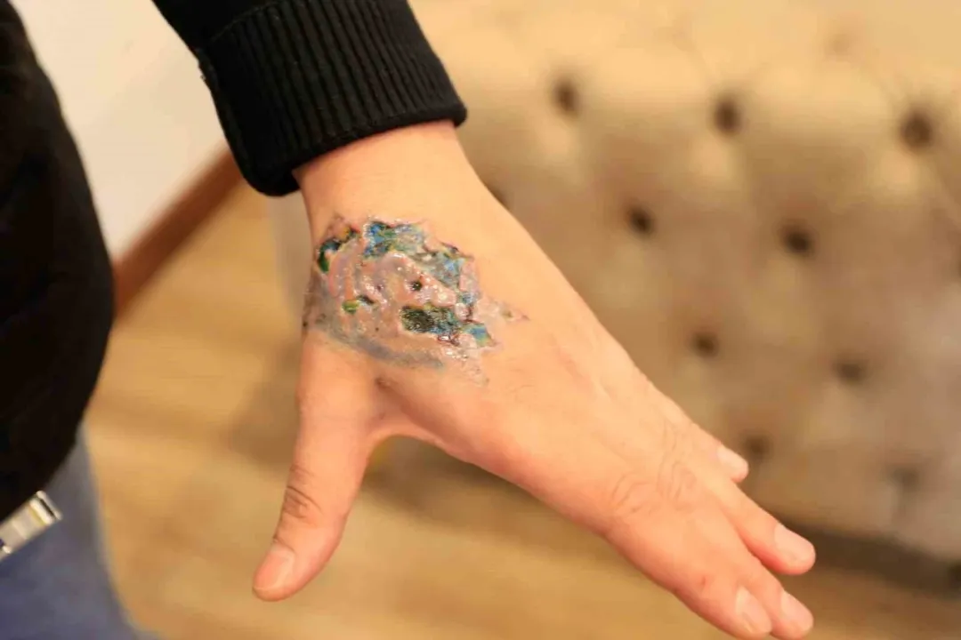 "Dövmemi sildirmek için bir güzellik merkezine gittim. Üçüncü seansta bayağı bir kötü oldu. Elimde ikinci derece yanıklar oluştu. Araç kaplama işi yapıyorum, genelde su ile işimiz oluyor ve şu anda elimi kullanamayacak durumdayım. Doktorlar Plastik Cerrahiye yönlendiriyor. Yanık bölgenin üzerine deri ekleme olacağını söylüyorlar"