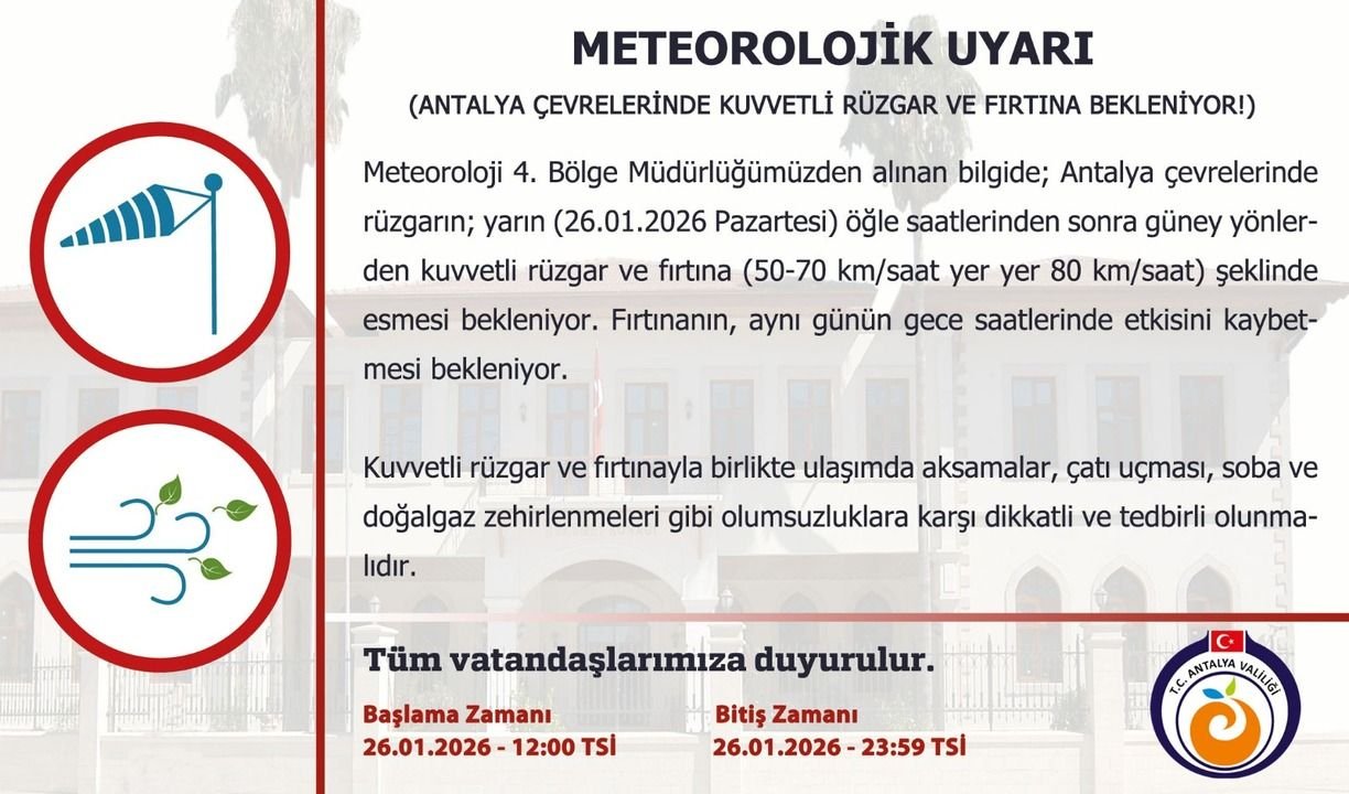 "Yapılan son değerlendirmelere göre; Antalya çevrelerinde rüzgarın; yarın (26.01.2026 Pazartesi) öğle saatlerinden sonra güney yönlerden kuvvetli rüzgar ve fırtına (50-70 km/saat yer yer 80 km/saat) şeklinde esmesi bekleniyor. Fırtınanın, aynı günün gece saatlerinde etkisini kaybetmesi bekleniyor.