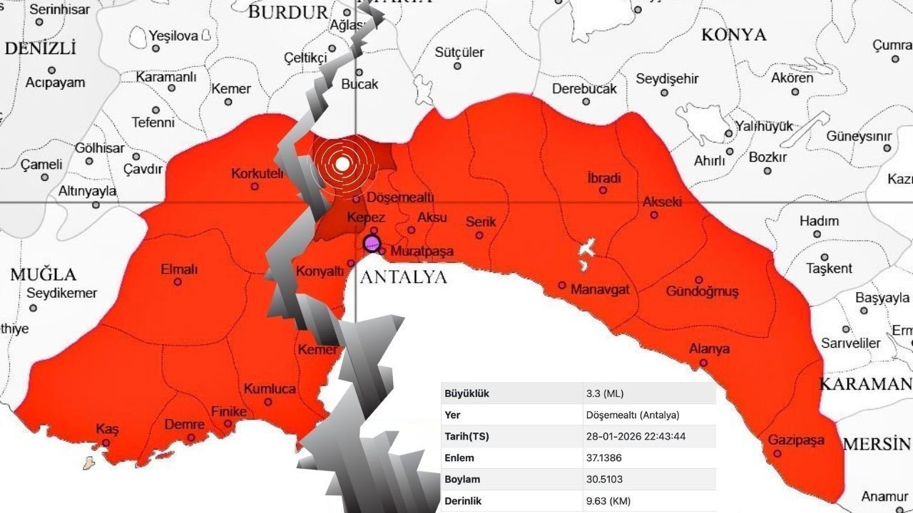 Afet ve Acil Durum Yönetimi Başkanlığı (AFAD) verilerine göre saat 22.43’te Antalya’nın Döşemealtı ilçesinde 3,3 büyüklüğünde deprem meydana geldi. Antalya'nın çeşitli semtlerinde dahi hissedilen depremde vatandaşlar panik yaşadıklarını belirttiler. AFAD'dan yapılan açıklamaya göre meydana gelen depremin yaklaşık 9,63 kilometre derinlikte gerçekleştiği belirtilirken bölgede herhangi bir olumsuzluk yaşanmadığı belirtildi.