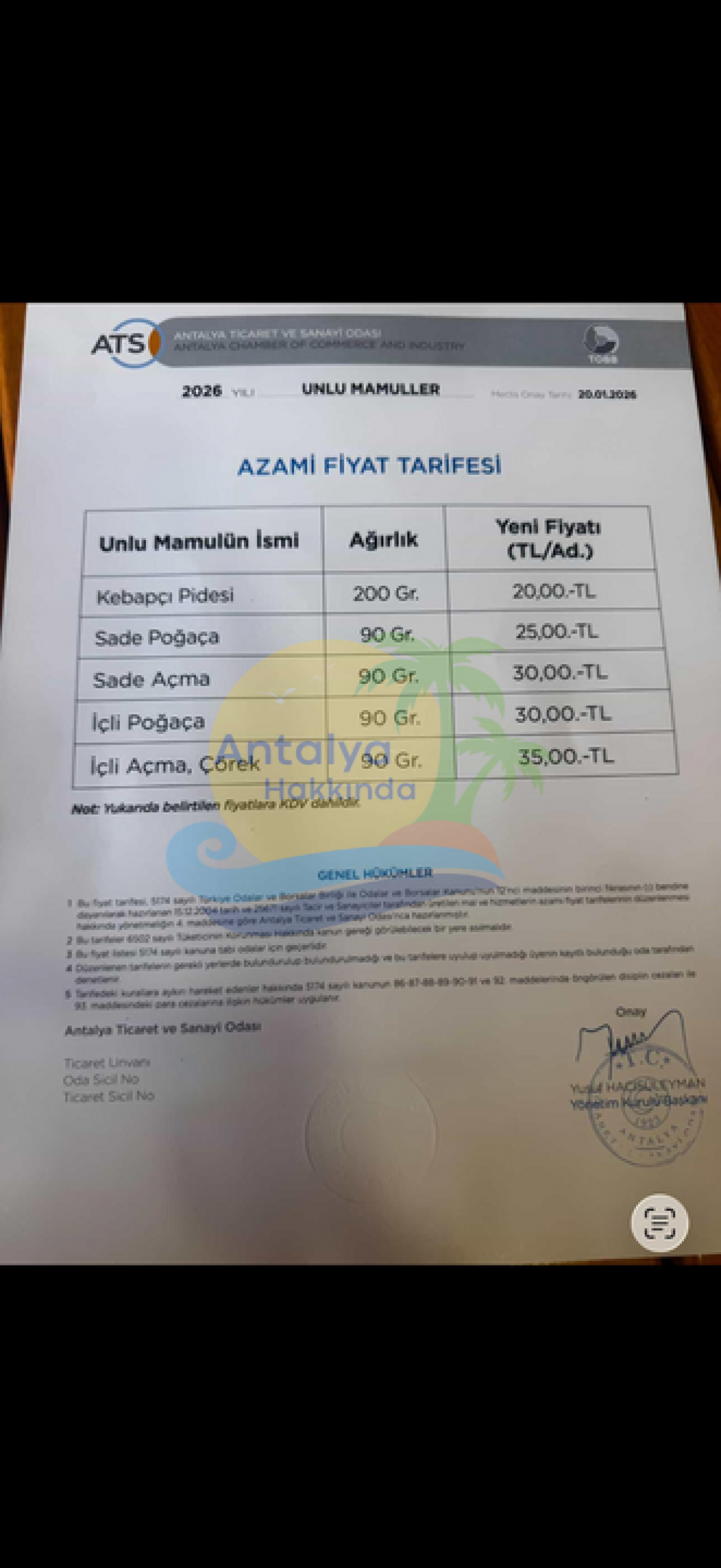 Antalya’da unlu mamullere uygulanacak yeni azami fiyatlar, Antalya Ticaret ve Sanayi Odası (ATSO) Meclisi’nde kabul edildi. 20 Ocak 2026 tarihli meclis toplantısında onaylanan tarife ile birlikte 2026 yılına ait unlu mamuller fiyatları belirlendi.