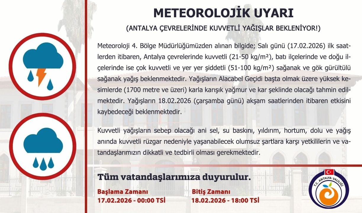 Meteoroloji 4. Bölge Müdürlüğü’nden alınan bilgiye göre, 17 Şubat 2026 Salı günü ilk saatlerden itibaren Antalya çevrelerinde kuvvetli yağış bekleniyor. İl genelinde 21-50 kg/m² aralığında yağış öngörülürken, batı ve doğu ilçelerinde ise 51-100 kg/m² arasında çok kuvvetli ve yer yer şiddetli sağanak ve gök gürültülü sağanak yağış tahmin ediliyor.
