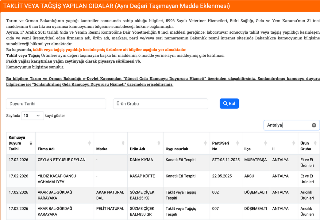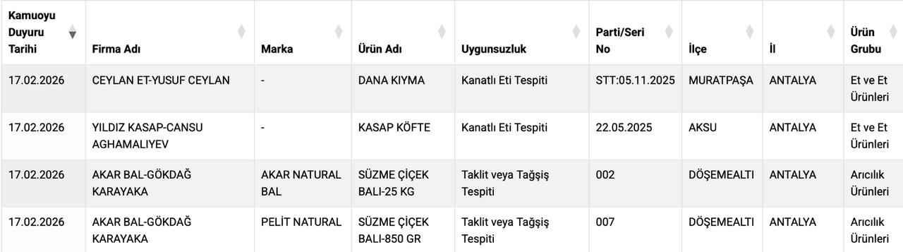 Güncellenen Taklit ve Tağşiş listesinde Antalya’nın çeşitli ilçelerinde faaliyet gösteren 4 ayrı firma yer buldu. Kasap, bal ve peynir satışı yapan işletmelerin bazı ürünlerinde tağşiş yapıldığı belirlendi. Bakanlık, söz konusu firmaları kamuoyuyla paylaştı.