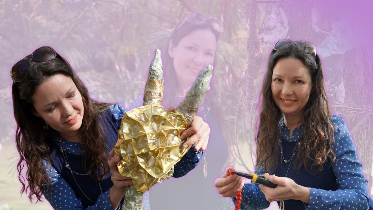 Geri dönüşüm atıklarından yeni oluşturduğu heykeli de anlatan Amirova, “ Altın renkli salyangoz figürümü bulaşık deterjanı şişelerinden yaptım. Çünkü artık her şeyin güzel bir yanı var" ifadelerini kullandı.