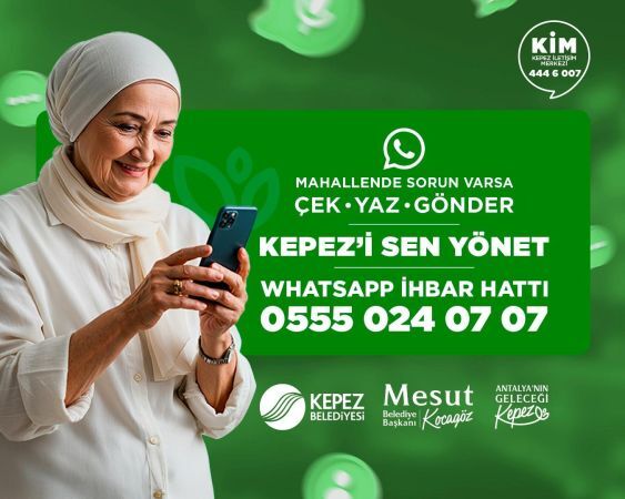 Kepez Belediyesi, ilçedeki 650 bin nüfuslu ve 68 mahalleden oluşan yerleşim alanında, sorunlara hızlı ve etkili çözümler sunabilmek için “Kepez’i Sen Yönet” projesini hayata geçirdi. Bu kapsamda, ilçe sakinleri yaşadıkları bölgedeki eksiklikler, talepler ve şikayetlerini 0 555 024 07 07 numaralı WhatsApp ihbar hattı veya 444 6 007 nolu Kepez İletişim Merkezi üzerinden belediyeye iletebilecek. Proje sayesinde vatandaşlar, temizlik, altyapı sorunları, park ve bahçeler, sosyal yardımlar gibi her türlü talebini anında bildirebilecek.
