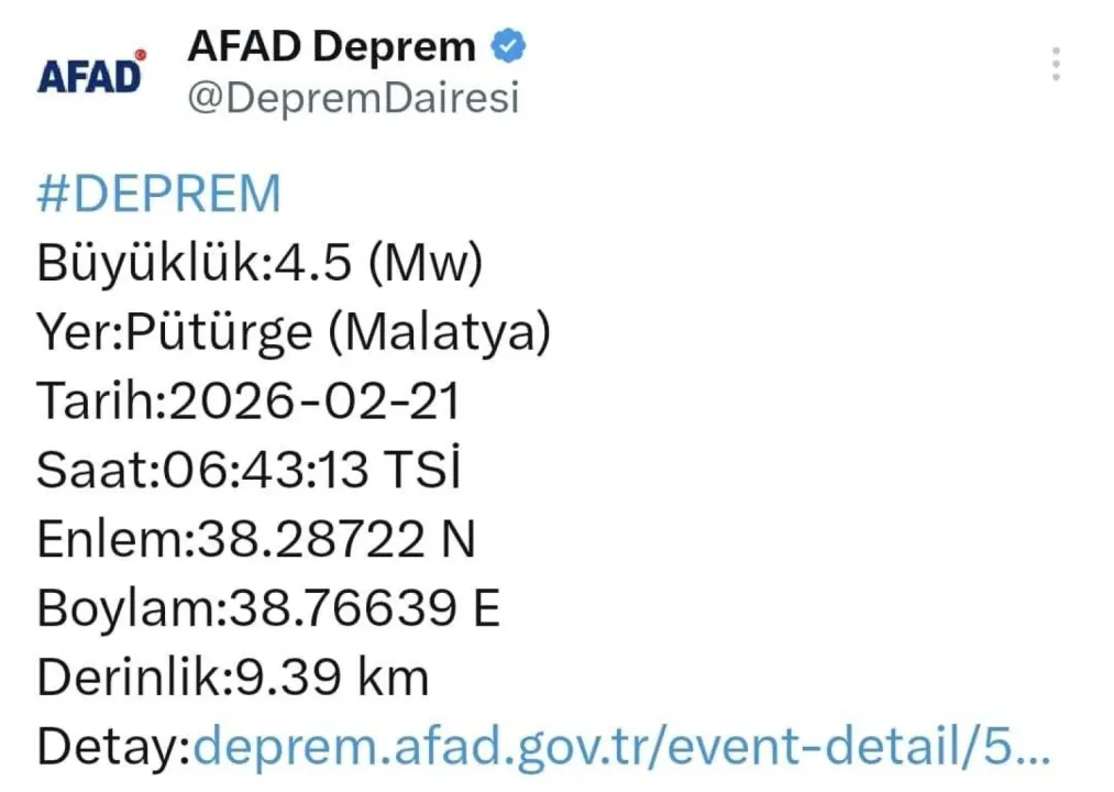 Afet ve Acil Durum Yönetimi Başkanlığı'nın (AFAD) verilerine göre, bu sabah saat 06.43'te merkez üssü Malatya'nın Pütürge ilçesi olan 4.5 büyüklüğünde deprem meydana geldi. Yerin 9,39 kilometre derinliğinde meydana gelen sarsıntı, vatandaşlar tarafından kısa süreli tedirginliğe neden oldu. Çevre il ve ilçelerden de hissedilen depremde ilk belirlemelere göre herhangi bir olumsuzluk yaşanmadığı belirtildi.