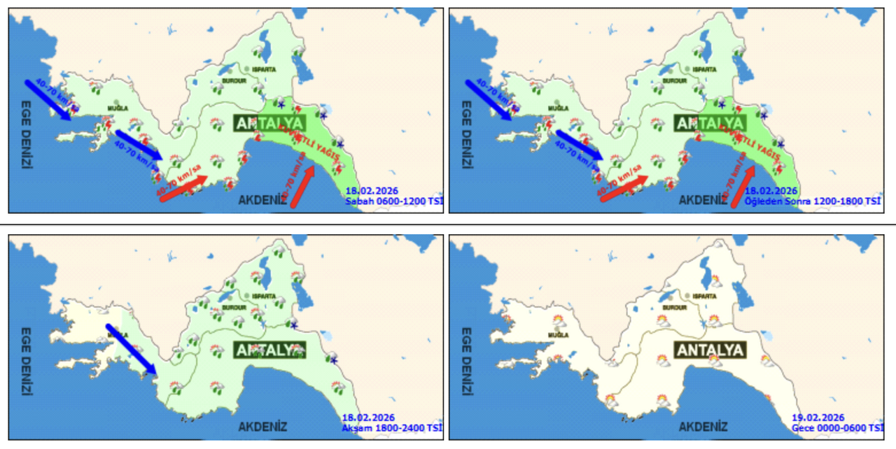 Yağışların Antalya’nın doğu kesimlerinde kuvvetli olması beklenirken, rüzgarın güney ve batı yönlerden fırtına, yer yer kuvvetli fırtına şeklinde eseceği bildirildi. Denizlerde de rüzgarın güney ve batı yönlerden fırtına, yer yer kuvvetli fırtına şeklinde etkili olacağı tahmin ediliyor. Yetkililer, olumsuz hava koşullarına karşı vatandaşların dikkatli ve tedbirli olmaları konusunda uyarıda bulundu.