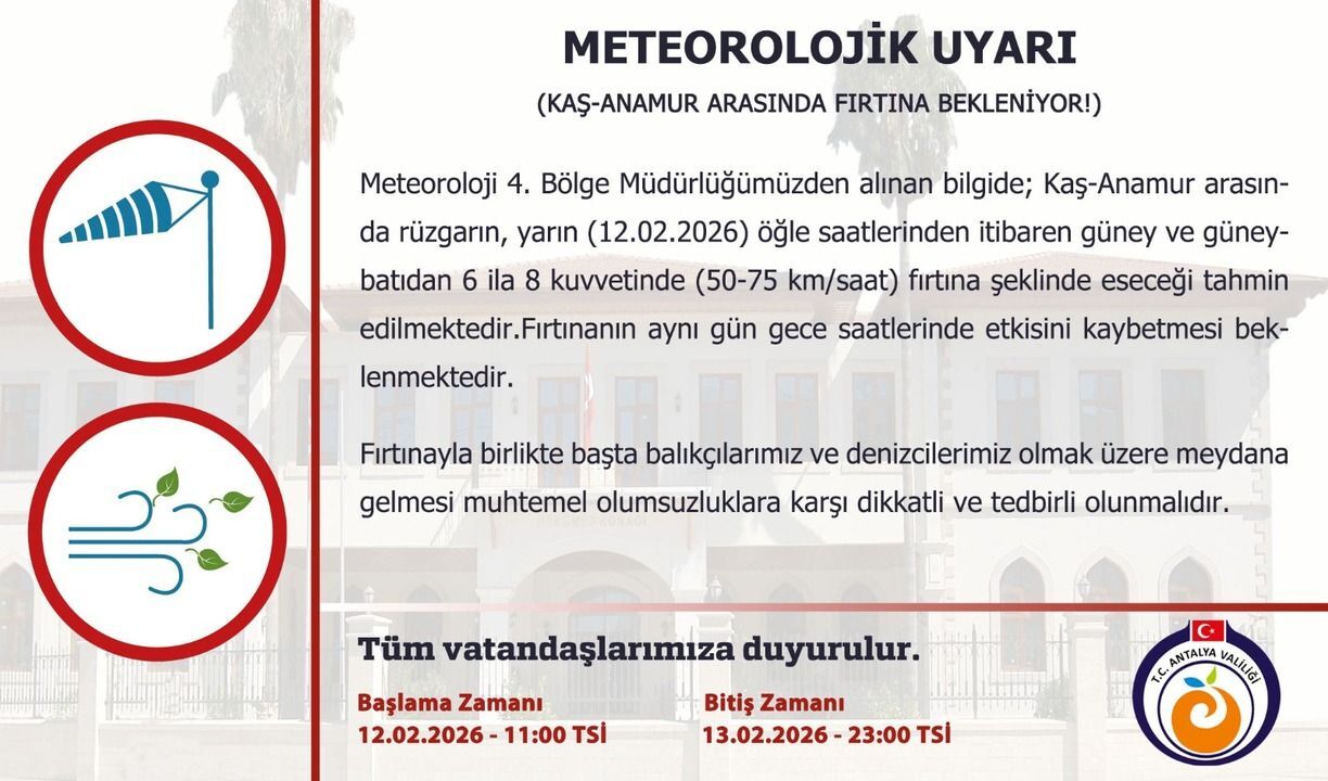 Meteoroloji 4. Bölge Müdürlüğü tarafından yapılan açıklamada, Kaş–Anamur arasında rüzgârın 12 Şubat 2026 günü öğle saatlerinden itibaren güney ve güneybatı yönlerinden 6 ila 8 kuvvetinde eseceğinin tahmin edildiği bildirildi. Yetkililer, rüzgâr hızının zaman zaman 50 ila 75 kilometreye ulaşabileceğini belirtti.