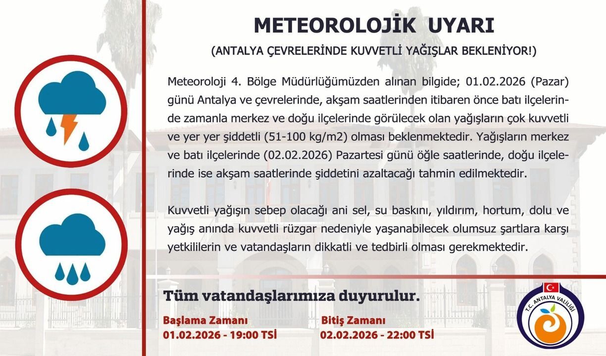 Başta balıkçılar ve denizciler olmak üzere tüm vatandaşların fırtınanın oluşturabileceği olumsuzluklara karşı dikkatli ve tedbirli olmaları istendi. Yetkililer, her iki meteorolojik uyarının da 1 Şubat Pazar günü saat 19.00’da başlayacağını, kuvvetli yağış uyarısının 2 Şubat Pazartesi günü saat 22.00’de, fırtına uyarısının ise 15.00’te sona ereceğini bildirdi.