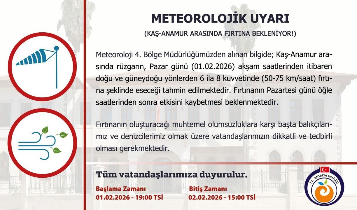 Öte yandan Meteoroloji, Kaş–Anamur hattı için de ayrı bir fırtına uyarısı yayımladı. Buna göre, söz konusu bölgede rüzgârın Pazar akşam saatlerinden itibaren doğu ve güneydoğu yönlerden 6 ila 8 kuvvetinde (50–75 km/saat) fırtına şeklinde eseceği tahmin ediliyor. Fırtınanın Pazartesi günü öğle saatlerinden sonra etkisini kaybetmesi bekleniyor.