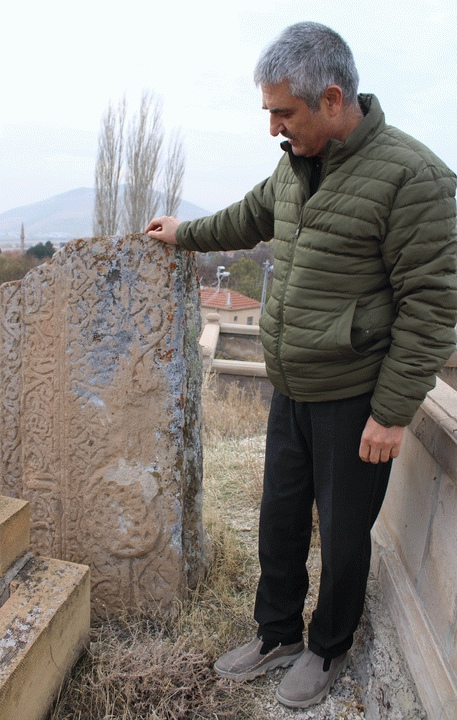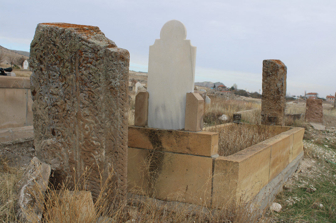 "Buradaki iki taşa çok yakından baktığınız zaman bizi en çok şaşırtan buraya ait olmayan bir taş. Bu kadar ihtişamlı bir mezar taşını ilk gördüğümüzde Selçuklu dönemini anlatan bir görüntü var. Çeşitli figürler var, oldukça sanatvari bir duruşu da var. Bununla beraber belki bir eksik kitabe olabilir. Bölgede bulamadığımız veya eksik olan bir kitabe buraya nakledilmiş olabilir. Veya bir kümbet parçası olabilir, yazı sitili uyuyor. Başka bir tahmin de bu bir lahit olabilir, Türk İslam Kültürü’nde böyle yapılarımız var. Bu lahit buraya yatay değil de dikine yerleştirilmiş olabilir. Arkasına ve önüne baktığımız zaman her iki tarafında da süslemelerin olması benzer çağrışım yapıyor. Sonuç olarak şunu söyleyebiliriz ki; buraya ait olmayan bir taş. Gerçekten bu hikaye doğru mu, onu da bilemiyoruz. Fakat çalışılması gereken, üzerinde yazanların deşifre edilmesi gereken önemli bir taş olarak değerlendiriyoruz"
