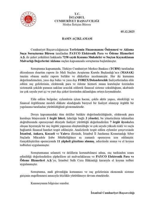 İstanbul Cumhuriyet Başsavcılığı tarafından yapılan açıklamaya göre, Terörizmin Finansmanını Önlenmesi ve Aklama Suçu Soruşturma Bürosu tarafından PAYCO Elektronik Para ve Ödeme Hizmetleri A.Ş. ile şirket yetkilileri hakkında 7258 sayılı Kanuna muhalefet ve suçtan kaynaklanan malvarlığı değerlerini aklama suçları kapsamında soruşturma başlatıldı. Soruşturma kapsamında Türkiye Cumhuriyet Merkez Bankası tarafından düzenlenen denetim raporu ile Mali Suçları Araştırma Kurulu Başkanlığı tarafından hazırlanan analiz raporları birlikte incelendi.