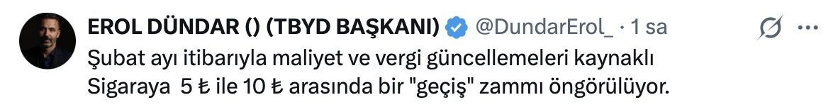 Tekel Bayileri Yardımlaşma Derneği Başkanı Erol Dündar, sosyal medya hesabından yaptığı açıklamada, şubat ayı içerisinde "maliyet ve vergi güncellemeleri" nedeniyle sigaraya 5 ile 10 lira arasında "geçiş" zammı beklendiğini duyurdu.