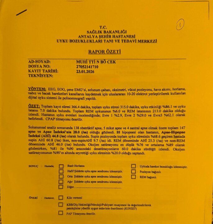 23 Ocak 2026 tarihinde yapılan polisomnografi (uyku testi) sonuçlarında, gece boyunca çok sayıda solunum durması ve azalması tespit edildi. Raporda, Apne-Hipopne İndeksi’nin (AHİ) saat başına ortalama 44,8 olarak ölçüldüğü kaydedildi. Bu değer, tıbbi sınıflandırmada “ağır derecede uyku apnesi” kategorisinde yer alıyor. Test bulgularında özellikle sırtüstü pozisyonda solunum bozukluklarının belirgin şekilde arttığı, kandaki oksijen satürasyonunun en düşük yüzde 76 seviyesine kadar düştüğü ifade edildi.