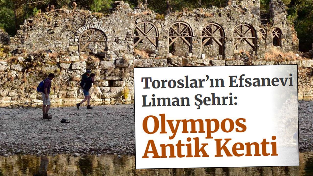 Olympos, Antalya’nın güney sahillerinde, Phaselis’ten sonra gelen ikinci büyük liman kenti olarak dikkat çeker. “Yüksek dağ” anlamına gelen adı, 16 kilometre kuzeyinde yükselen ve Toroslar’ın batı uzantılarından biri olan Tahtalı Dağından gelmektedir. Kesin kuruluş tarihi bilinmemekle birlikte, MÖ 167–168 yıllarında basılan sikkelerde adı geçmekte ve Likya Birliği’nde üç oy hakkına sahip altı şehirden biri olduğu görülmektedir. Kentin kalıntıları, Beydağları Sahil Milli Parkı sınırları içinde, Kemer ilçesinde konumlanmaktadır.