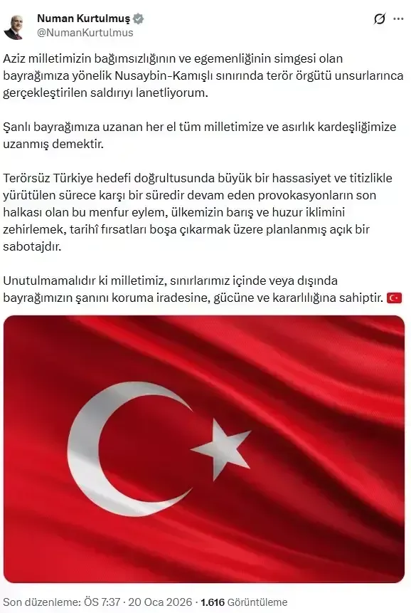 Meclis Başkanvekili Adan, saldırıya ilişkin, "Mardin Nusaybin sınırında bu milletin birliğine, merhametine, şefkatine ihanet eden terör örgütü Türk bayrağını indirme girişiminde bulunmuştur. Bu indirme iradesi Türk milletinin birliğine, beraberliğine kastetmek isteyenlerin bir provokasyonudur. Dünyanın neresine giderse gitsin bunlar cezalandırılır, cezalandırılacaktır. Biz de Divan olarak kınıyoruz" şeklinde konuştu.