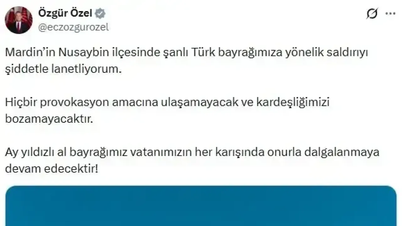 MHP Grup Başkanvekili Filiz Kılıç ise Türk bayrağına gerçekleştirilen saldırıya ilişkin, "Biz bayrağa bakınca sadece kırmızı beyaz görmeyiz; Yemen’de susuz kalanları, Sarıkamış’ta donanları, Çanakkale’de bir hilal uğruna batan o gencecik güneşleri görürüz. O kırmızının tonu herhangi bir boya küpünden değil, toprağa, ’Vatan sağ olsun’ diyerek düşen yiğitlerin şah damarından gelir. Bizim davamızın özü de sözü de budur. Milliyetçi Hareket Partisinin, ülkücü hareketin durduğu yer tam da o sancağı gölgesidir diyoruz. Türk Bayrağı’mızın indirilmesini tekrar kınıyoruz. Gerekenin yapılacağını da biz sabırsızlıkla bekliyoruz" diye konuştu.
