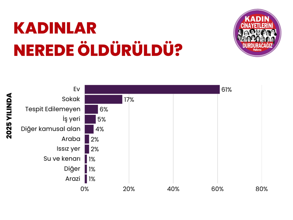 Kadınların 180’i evinde, 50’si sokakta, 15’i işyerinde, 11’i kamusal alanda, 7’si arabada, 5’i ıssız bir yerde, 3’ü su ve kenarında, 2’si arazide, 1’i otelde, 3’ü bunlar dışında bir yerde öldürüldürüldü. 17 kadının ise öldürüldüğü yer tespit edilemedi. Bu yıl öldürülen kadınların yüzde 61’inin evlerinde öldürüldüğü açıklandı.