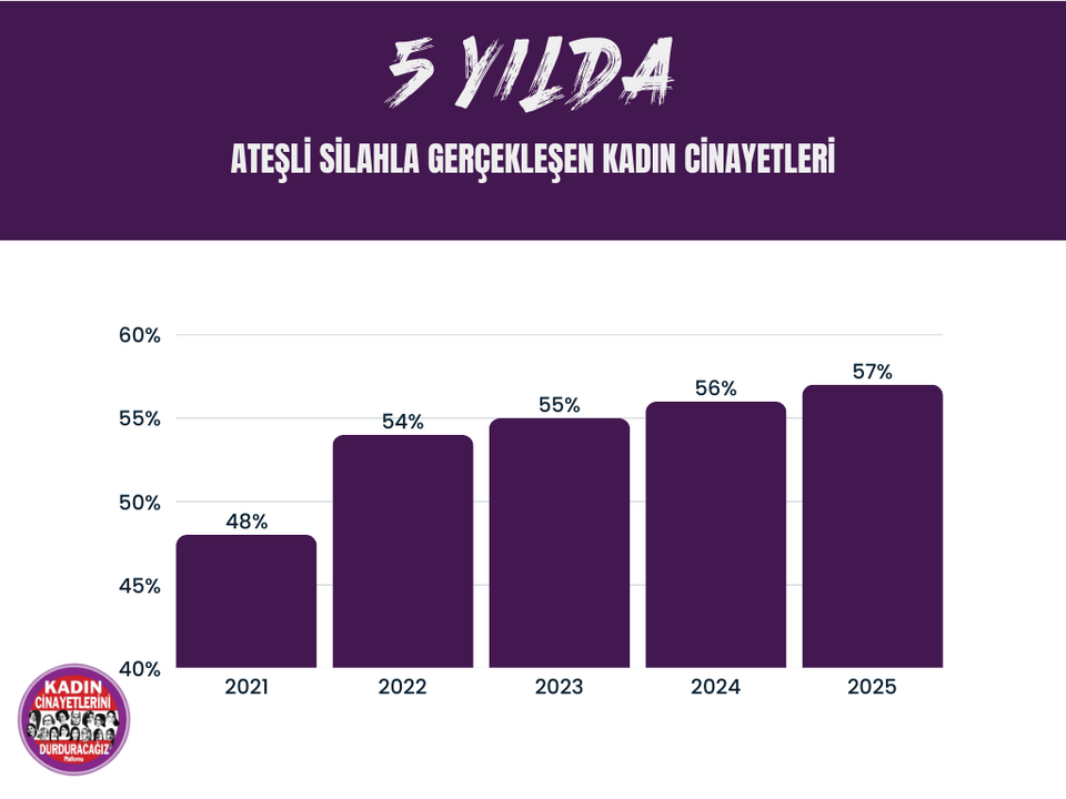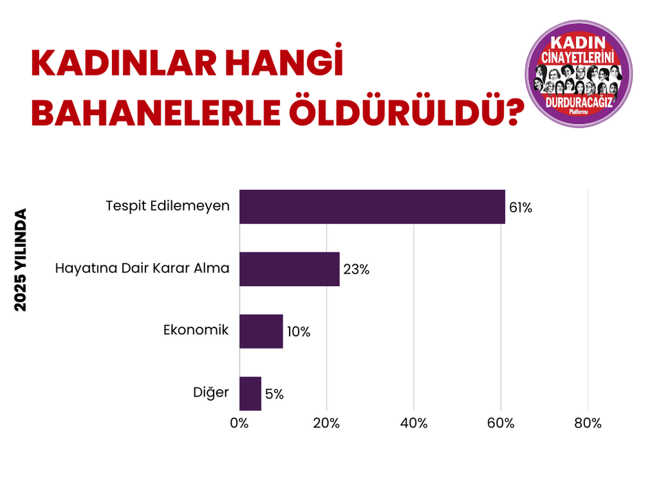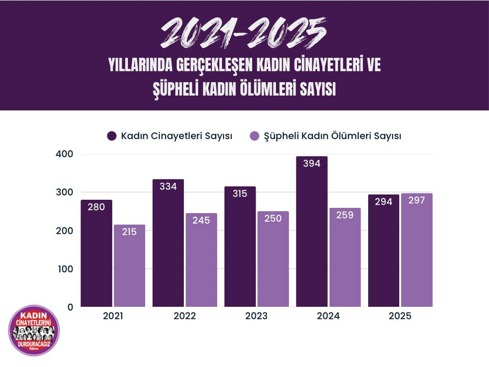 Kadın Cinayetlerini Durduracağız Platformu'nun açıkladığı 2025 yılı kadın cinayetleri ve şüpheli kadın ölümleri raporuna göre; Erkekler tarafından en az 294 kadın cinayeti işlendi, 297 kadın ise şüpheli şekilde ölü bulundu. Rapora göre, öldürülen 294 kadından 69’u, boşanmak istemek, barışmayı reddetmek, evlenmeyi reddetmek, ilişkiyi reddetmek gibi kendi hayatına dair kararlar almak istemesi bahanesiyle, 29’u ekonomik bahanelerle, 1’i nefret bahanesiyle, 16’sı diğer bahanelerle öldürüldü. 179 kadının ise hangi bahaneyle öldürüldüğü tespit edilemedi.