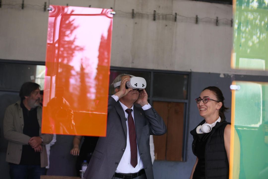 Kepez Belediye Başkanı Mesut Kocagöz, Bienal’in ana merkezi olan Pil Fabrikası yerleşkesindeki ana sergi alanlarını, yan sergileri, açık çağrı seçkilerini ve deneysel mimarlık üretimleri çalışmalarını gezdi. Başkan Kocagöz’e, Antalya Mimarlar Odası Başkanı Hasan Çerçiler ve Uluslararası Antalya Mimarlık Bienali Başkanı Prof. Dr. Celal Abdi Güzer eşlik etti. Büyük bir emekle hazırlanmış çalışmaları tek tek inceleyerek bilgi aldı ve emeği geçenlere teşekkür etti. Başkan Kocagöz, Deneysel Mimarlık İşleri’nde “Artırılmış Arada” temasıyla sergilenen Kara Surlarının Dijital İzleri çalışmasını inceledi. VR gözlüklerini takarak Kara Surları’nda çekilmiş filmler ve dijital görüntüler üzerindeki geçmiş ve günümüz arasındaki bağlantısını gözlemledi. Farklı boyutlardaki aynalardan oluşan LBRNT çalışmasında da, aynaların arasından geçerek kendi yansımasının çoğalmış halini gözlemledi. Başkan Kocagöz, Pil Fabrikası bahçesindeki bir diğer deneysel mimarlık çalışması olan MUSKOVİT’i de gezdi. Dairesel olarak yerleştirilmiş taşların, ışığın en parlak anında çözülme ile zamanın ve doğanın izlerini gözlemledi.