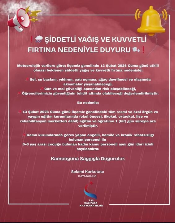 ''13 Şubat 2026 Cuma günü ilçemiz genelinde tüm resmi ve özel örgün ve yaygın eğitim kurumlarında (okul öncesi, ilkokul, ortaokul, lise ve rehabilitasyon merkezleri dahil) eğitim ve öğretime 1 gün süreyle ara verilmiştir.''